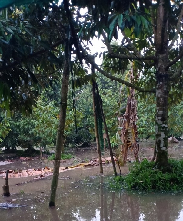 - Ngập nặng khi mực nước trong vườn dâng lên cao đến cổ rễ hoặc quá thân. Trước đây, tình trạng ngập chỉ xuất hiện do lũ về ở khu vực đất đồng bằng, Miền Tây hoặc do mưa nhiều, hồ thủy điện xã lũ ở đất vùng cao nhưng gần sông, hồ.